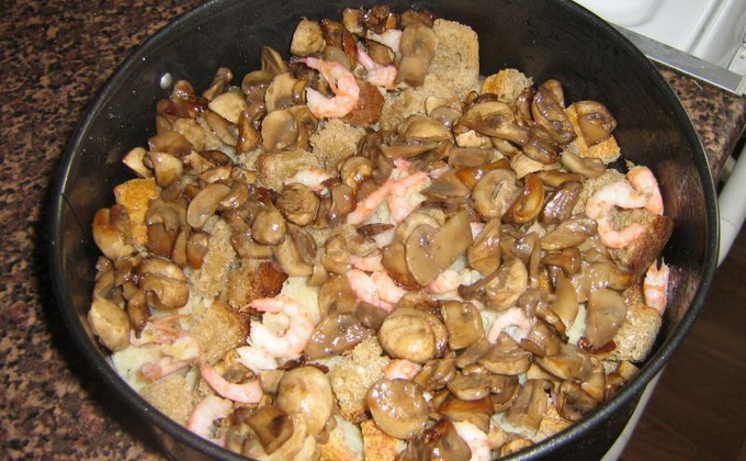 Avant de faire cuire des pommes de terre avec des champignons et de la crème sure, faites cuire les crevettes dans de l'eau salée avec des oignons, puis épluchez-les. Les broyer avec un couteau tranchant.