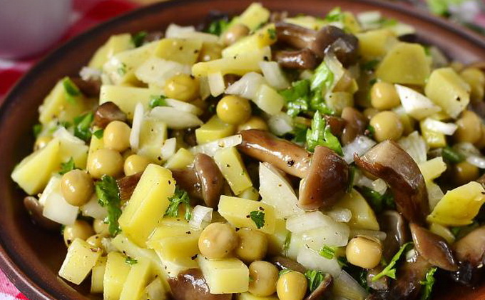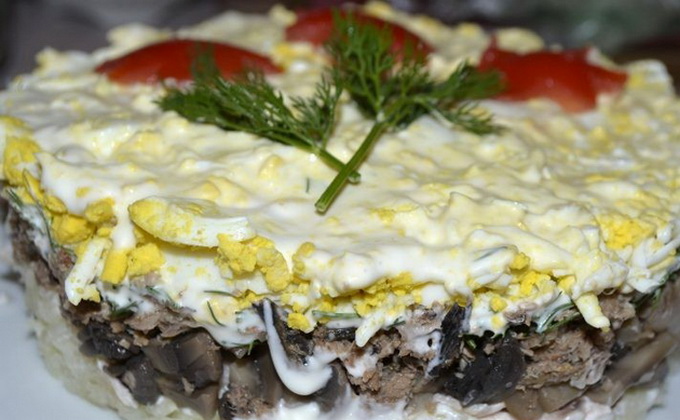Faire bouillir les pommes de terre, les carottes et les œufs, les peler et les couper en lanières. Ajoutez ces aliments ainsi que les pois verts à la masse totale. Saler la salade, assaisonner avec de la mayonnaise. Posez la salade sur une assiette, saupoudrez de petites herbes et décorez de champignons et de figures d'œufs.