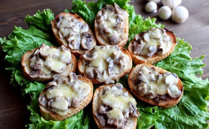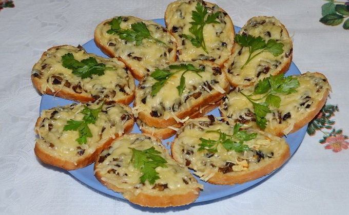 Faire bouillir les champignons séchés préalablement trempés, les hacher finement et les faire revenir dans une casserole, ajouter la farine, la crème sure et laisser mijoter pendant plusieurs minutes. Ajoutez le jaune, le sel, le poivre et mélangez bien. Tranches de pain avec du beurre, puis masse de champignons, saupoudrer de fromage râpé (1 cuillère à café pour chaque sandwich), mettre un petit morceau de beurre sur le fromage. Placez les sandwichs sur le gril. Cuire au four pendant 15 minutes à 205 ° C à la vitesse maximale.