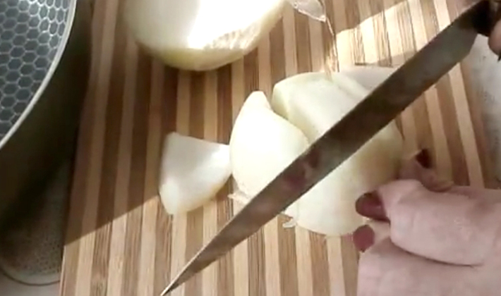 - Laisser égoutter et laisser refroidir, couper en tranches et faire revenir dans la moitié du beurre avec l'oignon dans le beurre pendant 20 minutes.