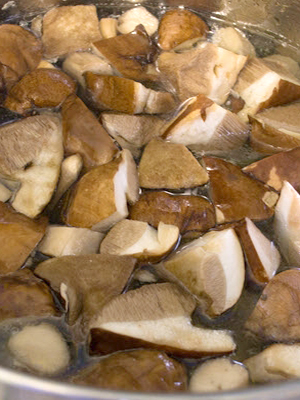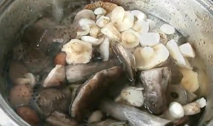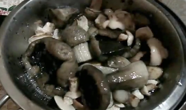 - Rincer les champignons après le nettoyage préliminaire, couper en plusieurs parties et laisser bouillir pendant 20 minutes.