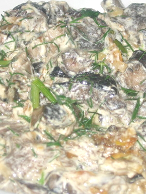- Mélanger la crème sure avec le sel, le poivre et l'ail pilé, fouetter un peu avec un fouet.