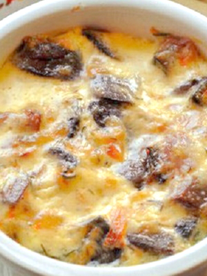 - Mettez les champignons, la viande et les oignons, versez la crème sure, saupoudrez d'une couche de fromage râpé.