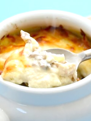 - Dans le beurre, faire revenir l'oignon haché jusqu'à ce qu'il soit rosé et le mettre dans la soupe.