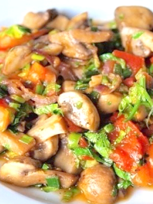 - Cuire les champignons avec les tomates pendant 15 minutes. et servir dans des plats en portions, garnis de tranches de tomates frites et d'herbes.