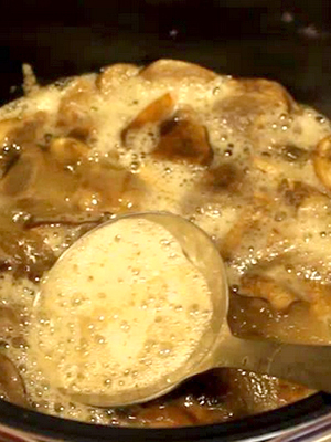 - Saupoudrer de farine, bien mélanger, verser la crème sure et le bouillon de champignons, saler et laisser mijoter 15 minutes.