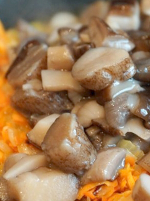 - Dans une casserole séparée, ½ partie de l'huile est faite de légumes frits jusqu'à cuisson complète, saupoudrés de champignons.