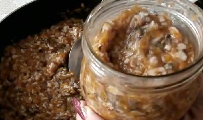 Stériliser pendant 20 minutes, fermer avec des bouchons serrés, laisser refroidir dans la pièce et placer dans une pièce fraîche. Ce caviar peut être consommé immédiatement, après avoir laissé refroidir.