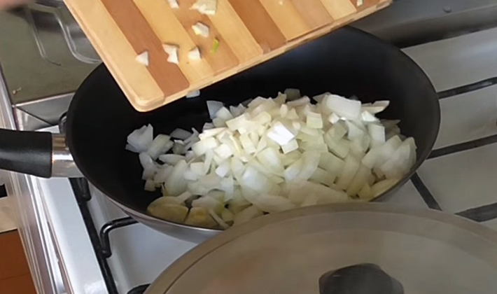 - Ajouter les oignons hachés et les faire frire à feu moyen pendant 5-7 minutes.