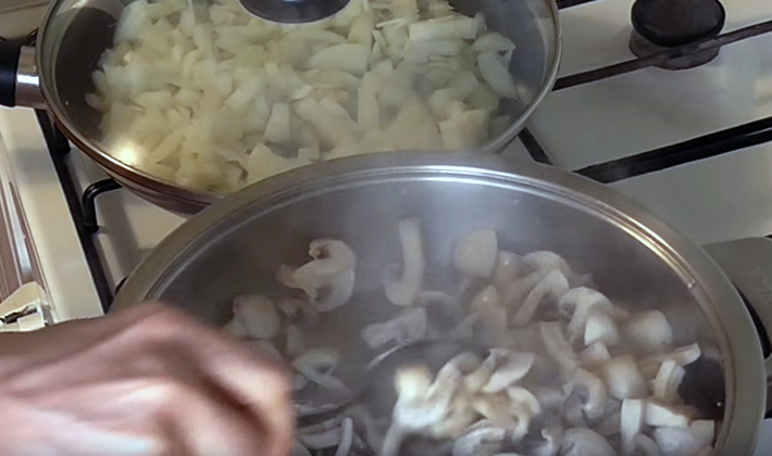 - Les oignons sont mélangés aux champignons, la masse entière est versée dans un plat allant au four, nivelé.