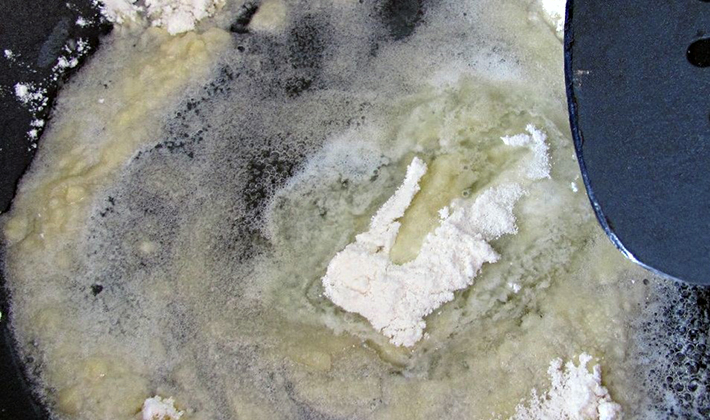 - Dans une poêle propre et sèche, faites frire la farine jusqu'à l'obtention d'un mélange crémeux et versez le bouillon chaud.
