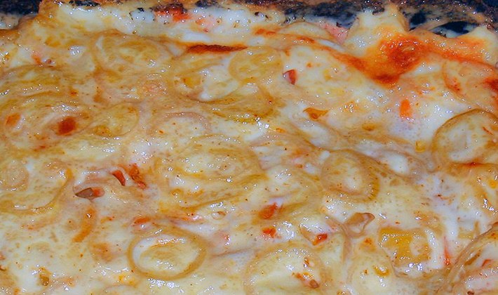- Saupoudré de fromage râpé sur une râpe fine et envoyé à un four chaud.