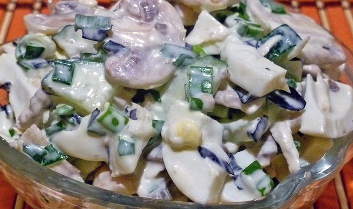 - Mélanger la sauce avec les champignons et les oignons dans un bol, saler au goût, ajouter de l'huile.