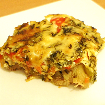Couper le poulet en morceaux de taille moyenne et les faire frire. Hachez et faites frire l'oignon. Épluchez, hachez et faites bouillir les champignons. Épluchez les pommes de terre, coupez-les en petits morceaux, faites les frire légèrement dans une poêle. Dans la forme, mettez d'abord le poulet, puis successivement les pommes de terre, les oignons, les champignons, les tomates, les légumes verts, le fromage râpé, coupé en fines tranches. Cuire au four environ 30 minutes.