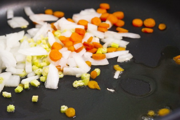 Dans une casserole avec de l'huile d'olive, versez finement les oignons, les carottes et les poivrons hachés finement.
