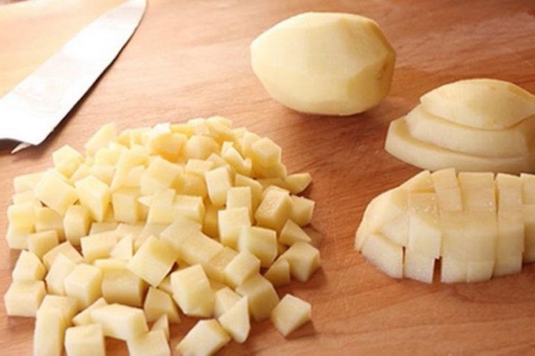 Épluchez les pommes de terre et les oignons et lavez-les, puis coupez-les en cubes. Tous ensemble, nous envoyons le bol aux huiles et remplissons d’eau jusqu’au repère indiqué sur l’appareil.