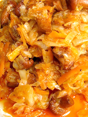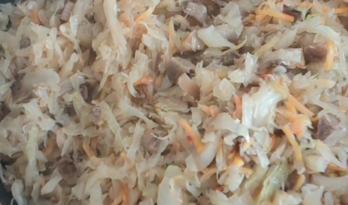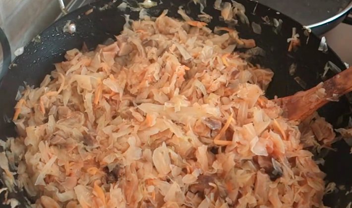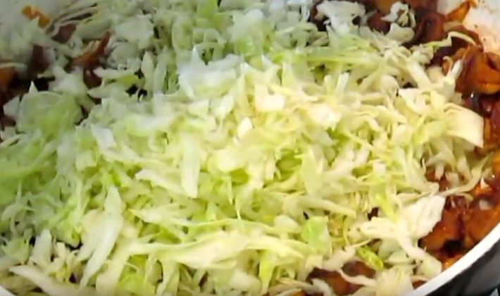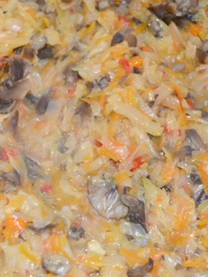 - Le chou est haché, ajouté aux légumes et aux champignons, frit pendant 15 minutes.
