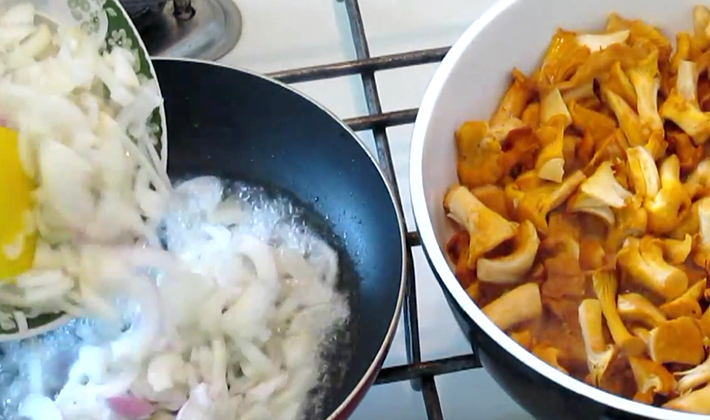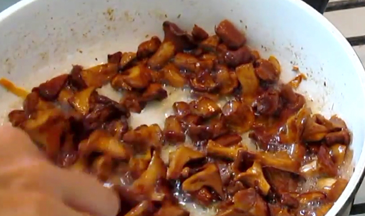 - Les girolles bouillies sont coupées en lanières, réparties dans une casserole et faites frire jusqu'à évaporation du liquide.