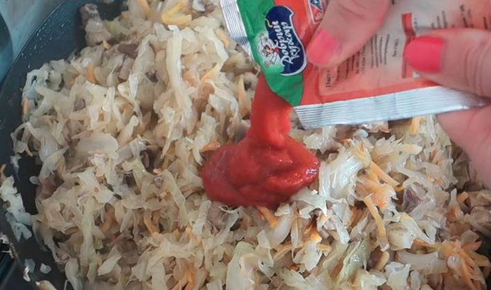 - Le chou, les champignons, la viande hachée, les carottes et les oignons sont combinés, de la pâte de tomate diluée avec de l'eau est introduite.
