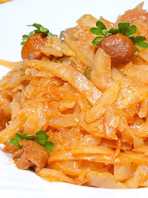 - Coupez le chou en lanières et faites-le frire dans l'huile pendant 20 minutes. à feu moyen.