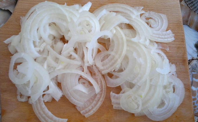 Épluchez l'oignon, rincez-le sous l'eau et coupez-le en demi-anneaux.
