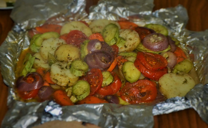 Tous les légumes sont coupés et préparés. Il reste quelques coups - sel, ajoutez des épices et de l'ail haché, de la mayonnaise et de l'huile végétale. Le mélange entier a été soigneusement transféré et transféré dans le manchon préparé. Après l'avoir noué, j'ai fait quelques piqûres avec un cure-dent dans la partie supérieure. La gaine est maintenant prête pour le four préchauffé pendant 40 minutes à une température d’environ 200 degrés.