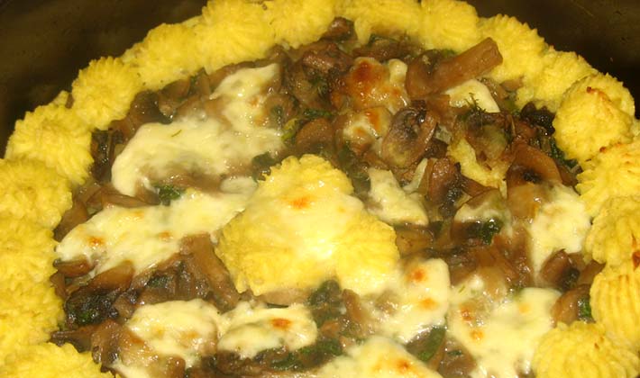 Abaisser la pâte en 2 couches, en mettre une dans un moule ou sur une plaque à pâtisserie recouverte de papier sulfurisé huilé, former de grands côtés. Saupoudrer la surface de fromage râpé, déposer la purée de pommes de terre et les champignons sur la purée de pommes de terre.