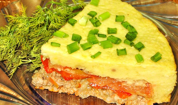 - Lubrifiez le bol multicuiseur avec du beurre. Verser environ 2/3 de la pâte. Étalez doucement les pommes de terre, recouvrez la viande, versez le reste de la pâte.
