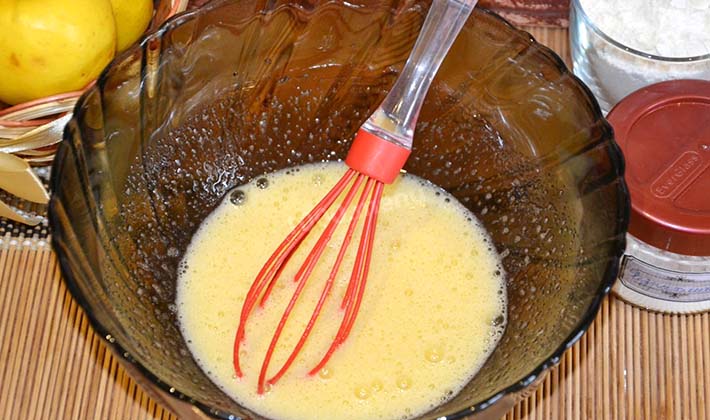 - Tamiser la farine avec la levure chimique, ajouter aux oeufs avec la mayonnaise. Continuez à fouetter jusqu'à la formation d'un mélange épais, fluide et homogène.