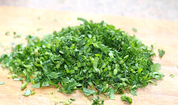 Rincer la viande, les pommes de terre et les oignons et les couper en petits morceaux. Faire bouillir les champignons et les hacher finement.