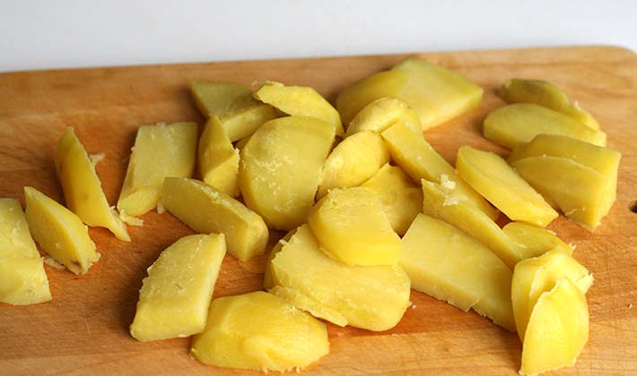 - Épluchez et coupez les pommes de terre très finement - vous pouvez faire pipi.