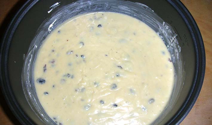 - Lubrifiez le bol multicuiseur avec du beurre. Verser environ 2/3 de la pâte. Répartir doucement le remplissage, verser le reste de la pâte.