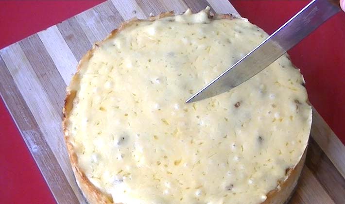 Cuire le gâteau dans un four préchauffé à 180–200 ° C pendant 15–20 minutes. Puis couvrez le moule avec du papier d'aluminium et faites cuire pendant 15 à 20 minutes. Graisser le gâteau fini avec du beurre fondu.