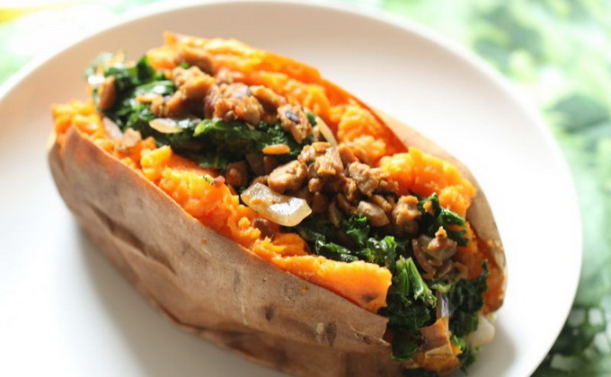 Les pommes de terre pelées bien lavées sont cuites au four. Coupez le haut d'eux. Une cuillère à café est choisie à partir du milieu de la pomme de terre afin que les parois de la pomme de terre aient une épaisseur de 1 cm. La masse de pommes de terre est mélangée avec des champignons et de la viande hachée, du jaune, 2 c. cuillères de crème sure, épices. La protéine de battement y est ajoutée, mélangée. Le milieu des pommes de terre est salé et rempli d'une masse de pommes de terre et de viande. Les pommes de terre farcies de viande hachée et de champignons sont mises au four sur une plaque à pâtisserie, arrosées du reste de crème sure, mélangées à du jaune et dorées. Les pommes de terre farcies aux champignons et la salade sont cuites selon cette recette.