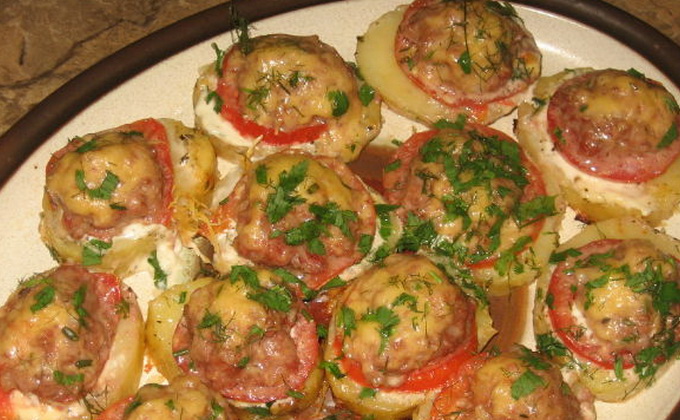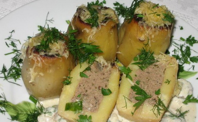 - Remplissez les tubercules de pommes de terre avec cette viande hachée et placez-les sur un plat graissé. Verser la sauce à la crème sure, saupoudrer de fromage râpé mélangé à de la chapelure moulue, arroser d'huile et cuire au four.