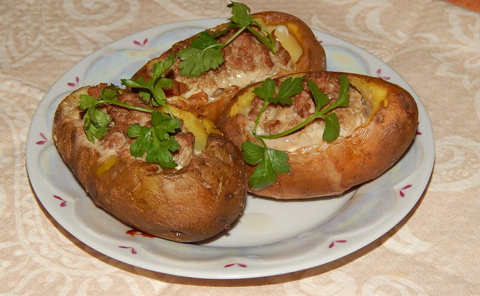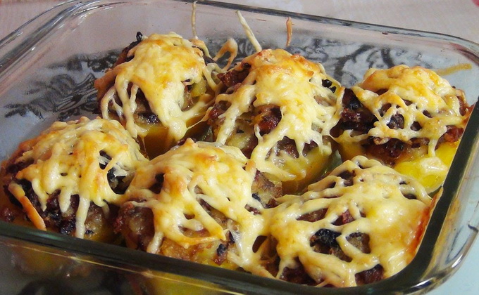 Pommes de terre farcies aux champignons et à la viande hachée: recettes pour le four