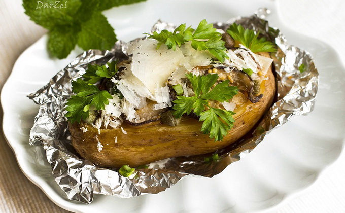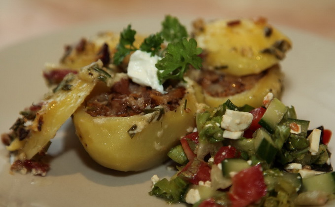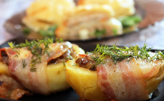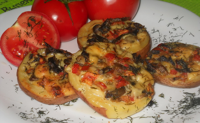 Cuire au four pendant 15 minutes à une température de 160 - 170 degrés. Nous avons, saupoudrer d'herbes hachées. Pommes de terre à la française fourrées aux champignons et servies uniquement avec de la crème sure.