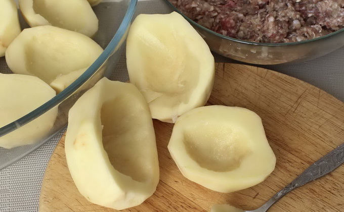 - Épluchez les pommes de terre crues, coupez le dessus, coupez le cœur avec une cuillère à thé et remplissez de viande hachée.