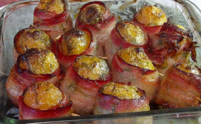 Enveloppez chaque pomme de terre farcie dans une tranche de bacon.