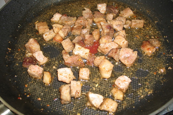 Pour cuire des pommes de terre à l'étouffée avec du porc et des champignons selon cette recette, la viande est coupée en petits morceaux (chacun deux à deux centimètres).