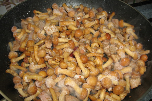 Les champignons sont frits dans du beurre, et on y ajoute des oignons et des carottes. Combiner avec la viande, les pommes de terre et mélanger. Il est transféré dans un chaudron ou un chaudron. Ajouter l'eau et la crème sure, laisser mijoter environ trente minutes.
