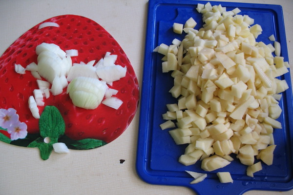 À l'aide d'un coupe-légumes, épluchez les pommes de terre, puis rincez-les bien à l'eau courante afin d'éliminer tout reste de terre et autres saletés. Maintenant, placez les tubercules sur une planche à découper et coupez-les en petits cubes. Les légumes déchiquetés sont transférés dans un petit bol et complètement remplis d’eau froide ordinaire afin que les pommes de terre n’interagissent pas avec l’air.