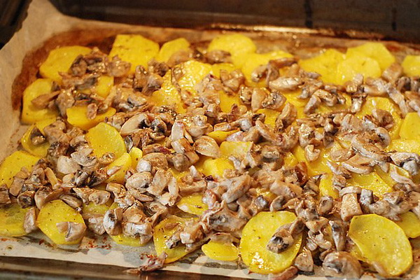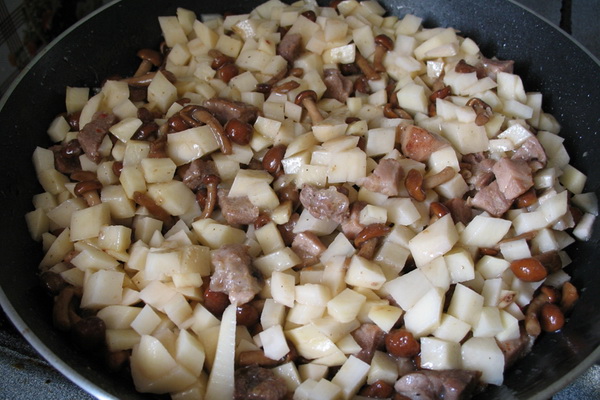 Des morceaux de viande sont disposés au centre de la casserole, des pommes de terre sont disposées et des champignons sont placés sur le dessus. Le tout est versé avec du lait et de la sauce aux œufs. Saupoudrer d'oignons.