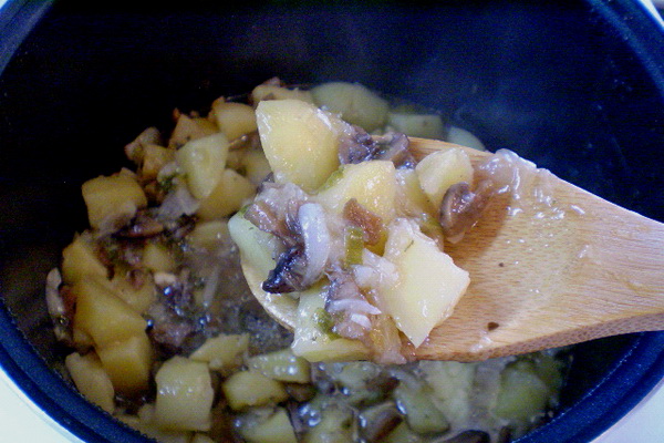 Après cela, les champignons broyés sont ajoutés et continuent à frire. Épluchez les pommes de terre, coupez-les en lanières, hachez l'oignon finement et mettez dans la mijoteuse.