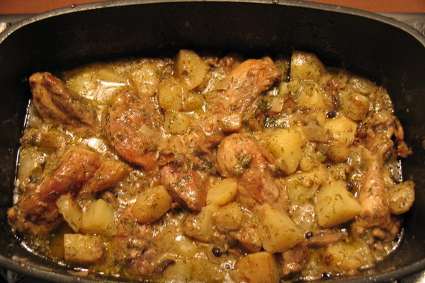 Le plat de cuisson est graissé avec de la graisse et la viande y est tartinée. Des pommes de terre en tranches sont disposées sur le dessus. Cuire au four pendant trente-cinq minutes.