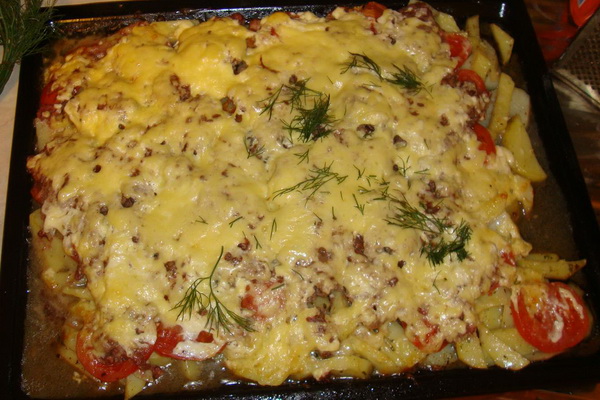 Le fromage est râpé. Ajouter ces ingrédients aux pommes de terre avec de la viande et cuire encore une demi-heure.