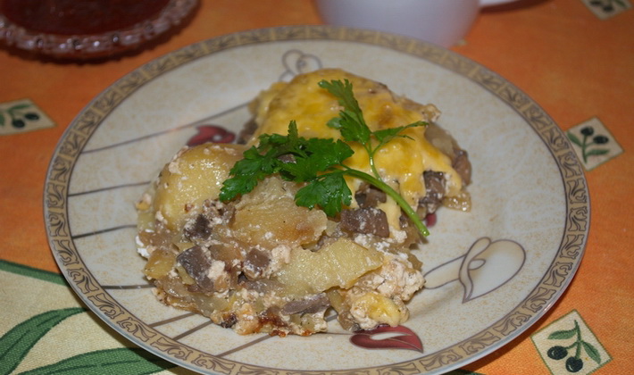 - Étalez à nouveau une couche de pommes de terre, salez, poivrez. Saupoudrer de champignons.