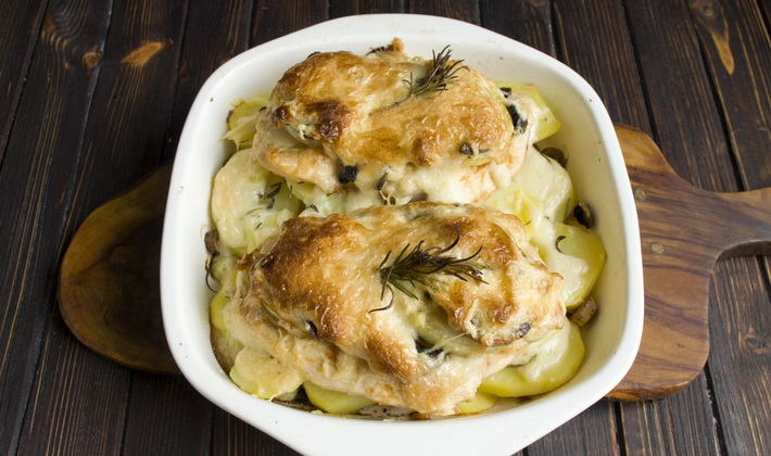 - Couper le poulet en morceaux, assaisonner d'épices et déposer sur les pommes de terre.