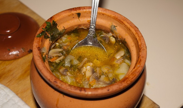 Couper les champignons en lanières et les mettre dans la casserole. Ajouter une partie du bacon frit avec des oignons et faire frire le tout, puis ajouter de l'eau et laisser mijoter. Au milieu du ragoût, ajoutez des pommes de terre crues ou frites, hachées. Au moment de servir, ajoutez le reste du bacon grillé avec des oignons, de la crème sure et du sel au goût.