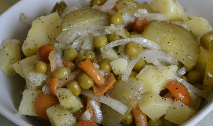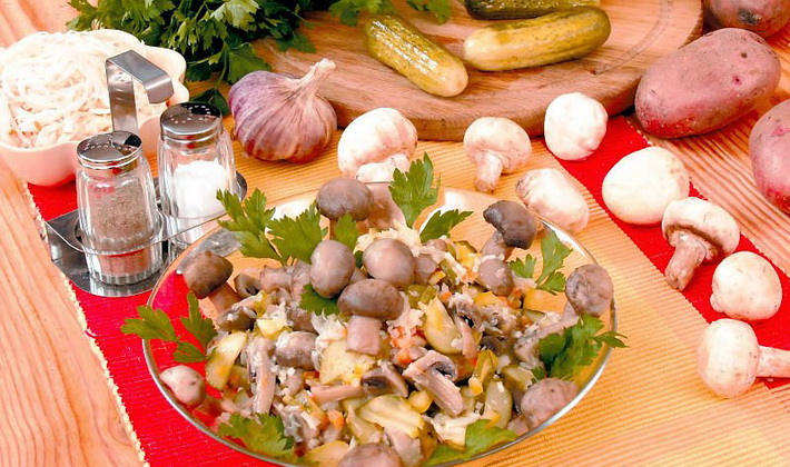 Pour préparer une salade de champignons marinés avec des pommes de terre, tous les ingrédients doivent être coupés en dés, le sel, ajouter les pois verts en conserve. Ajouter les champignons hachés. Mélangez le tout avec de la mayonnaise.